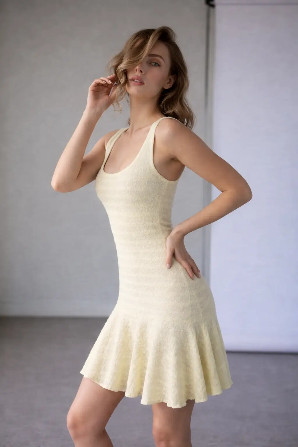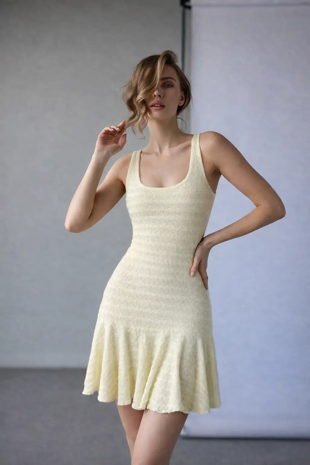 Tags: Buttercream, Dress, knee length dress, pale yellow, Sleeveless, spring