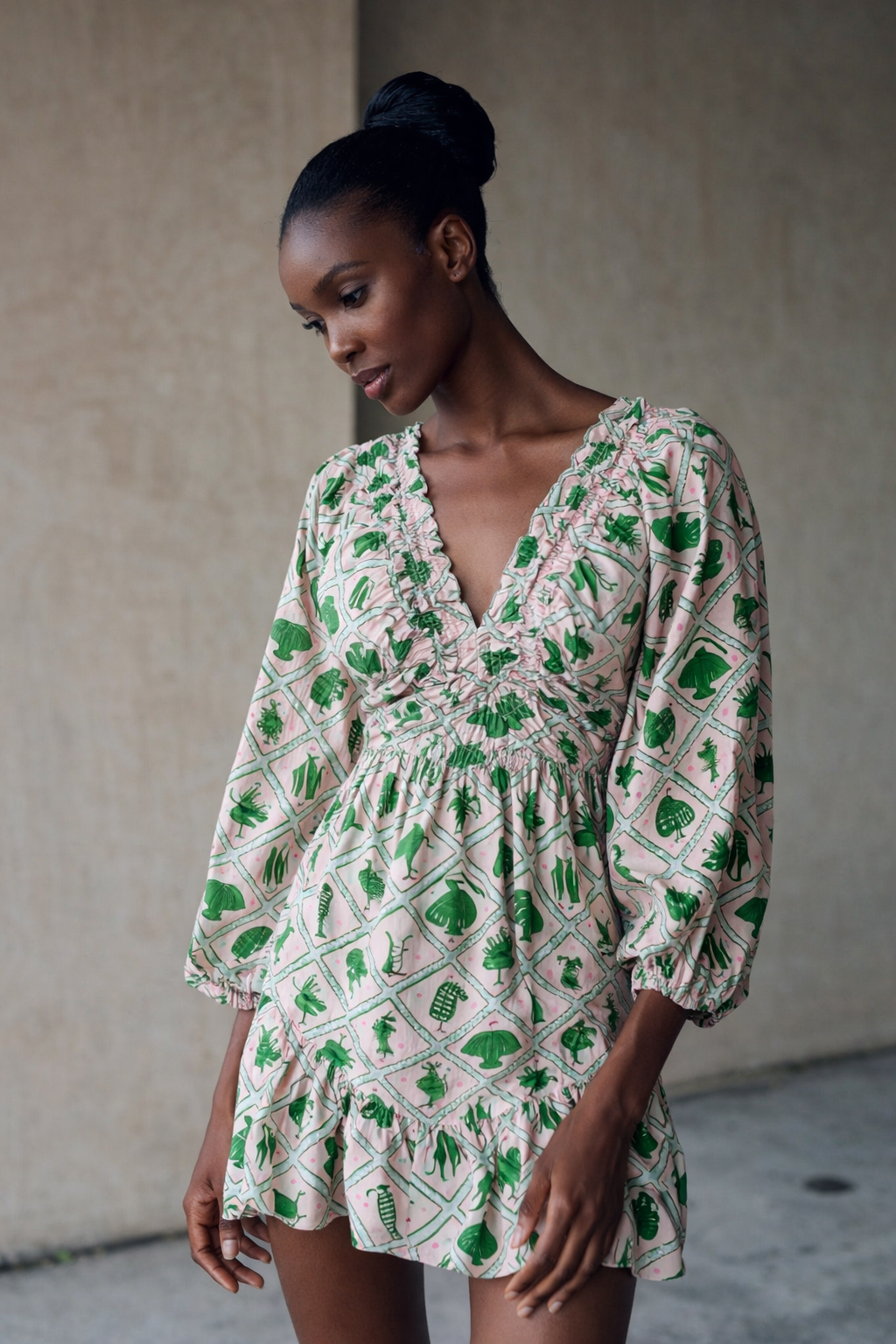 Hadley Mini Dress features a flattering fit, blush pink and green print, blousy sleeves, and a softly ruffled hem for an elegant spring to summer look.