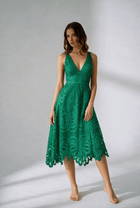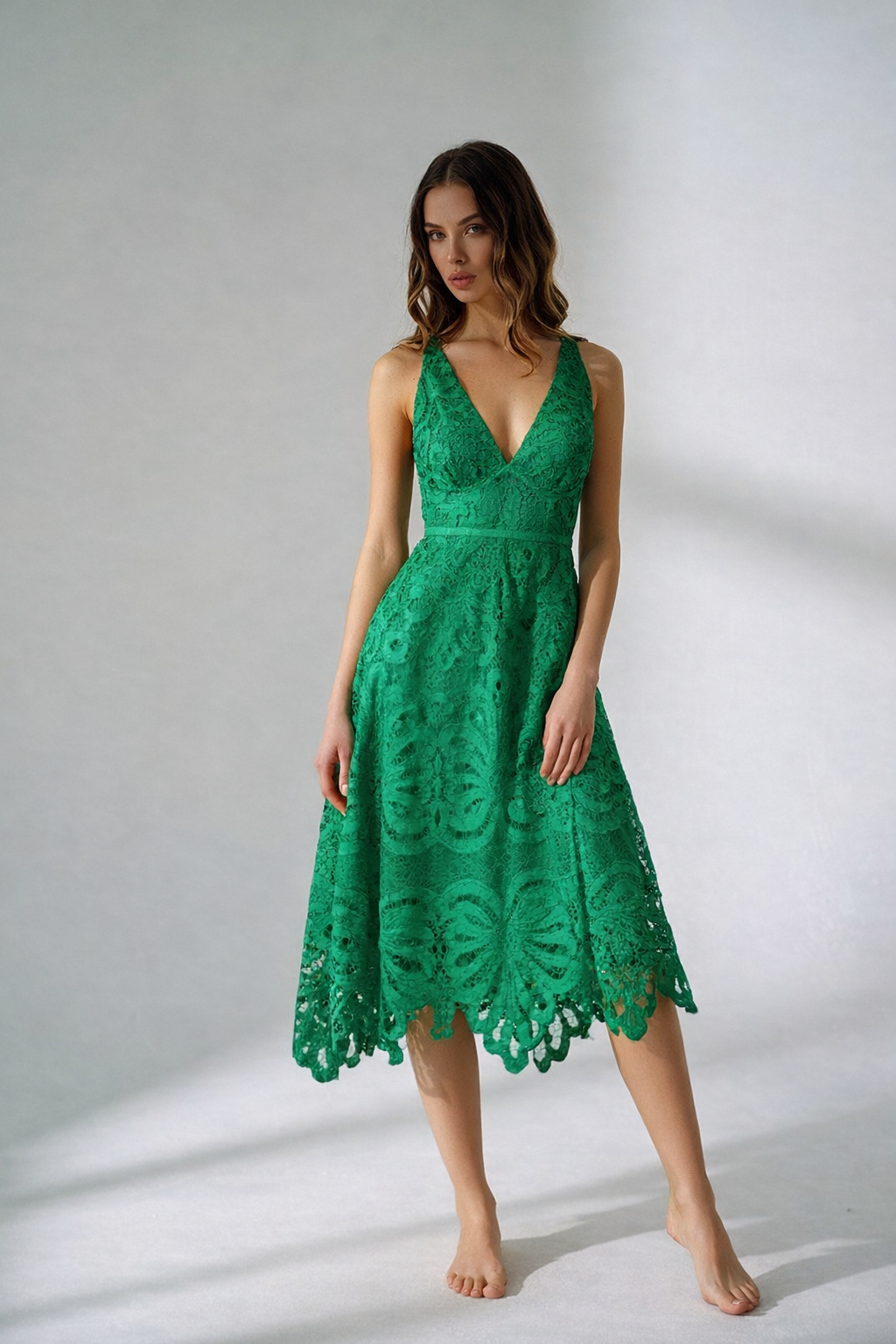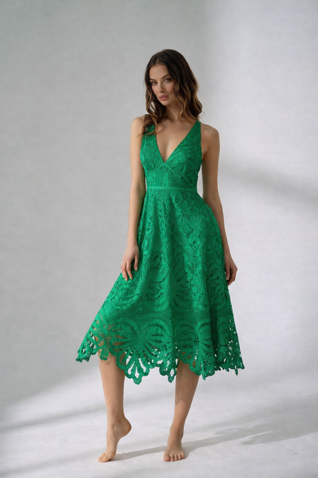 This Kelly Green Eyelet dress features a vibrant hue paired with a delicate eyelet design, creating an elegant look. The empire waist and semi-formal style make it a versatile choice for various occasions.