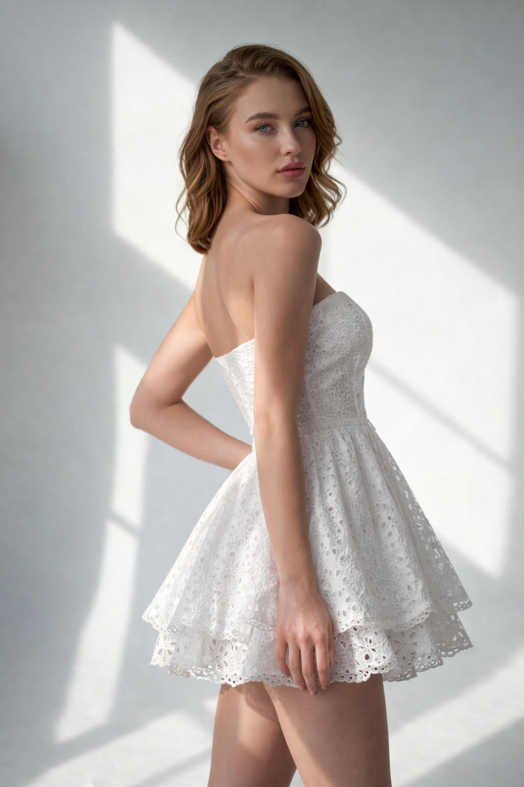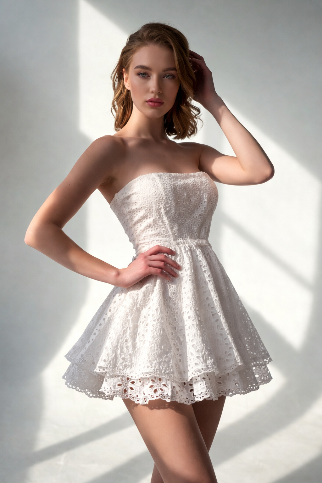 Mon Petit Eyelet Mini Dress captures the kind of effortless femininity that makes warm-weather dressing feel instantly polished. Designed in crisp white eyelet fabric, this elegant mini dress features a flattering strapless bodice, a defined waist, and a layered skirt that adds soft movement with every step. The intricate eyelet texture gives the look timeless charm, while the clean silhouette keeps it fresh, modern, and easy to style for daytime plans, weekend outings, and special summer moments.