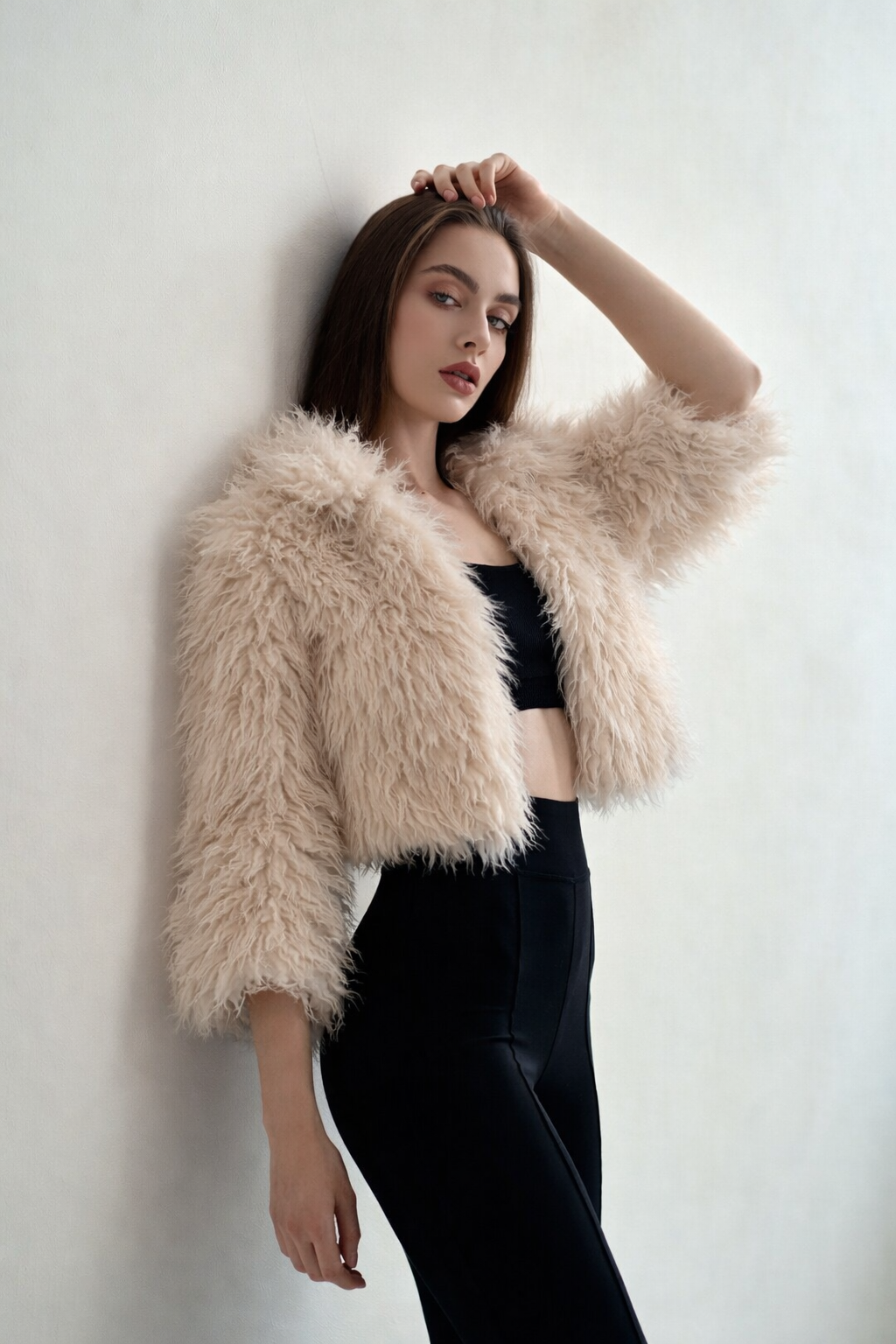 Flaunt your bohemian style with the Mongolian faux fur cream jacket. This jacket sits just at the waist with a hook and eye closure that is hidden within the fur. Composition: 100% polyester lining:polyester