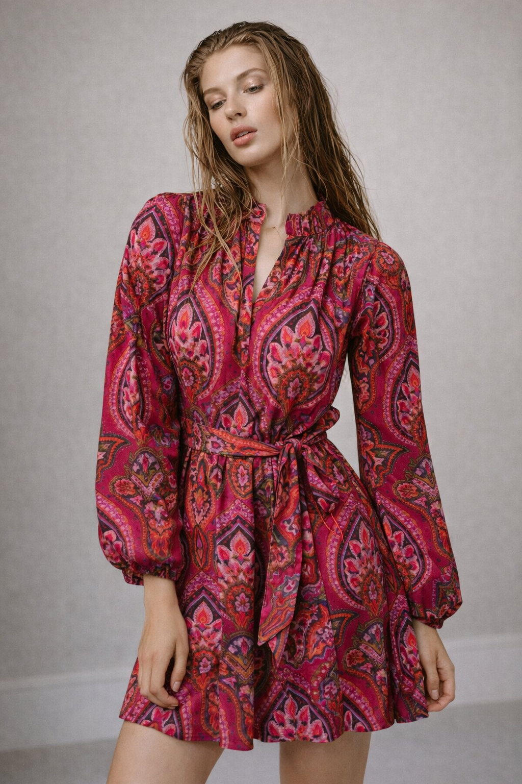 The Azura floral dress features a vibrant floral print and flattering silhouette designer for versatile styling. With elastic waist, and balloon short sleeves, this Azura Paisley Poplin Mini dress pairs effortlessly with your favorite heels or sandals and 100% cotton.