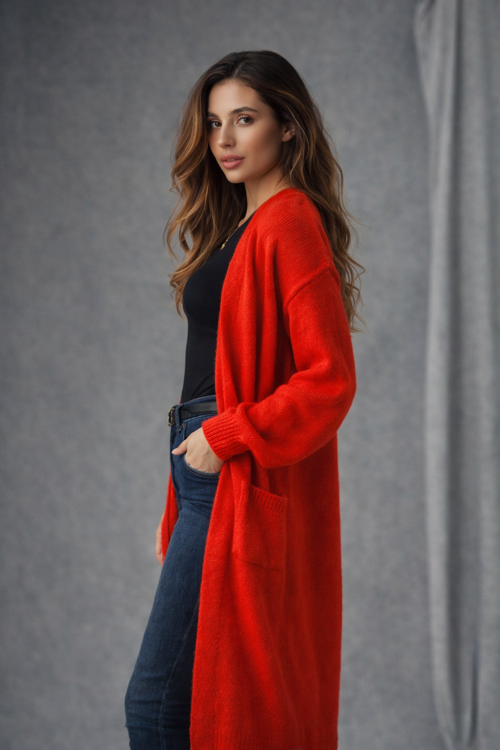 The Panache red cardigan features a stylish long-knit design with a comfortable fit, making ita versatile addition to any wardrobe. Its vibrant red color enhances its appeal, and is suitable for both casual and formal occasions. It has two side pockets and is 100% acrylic.Additional information