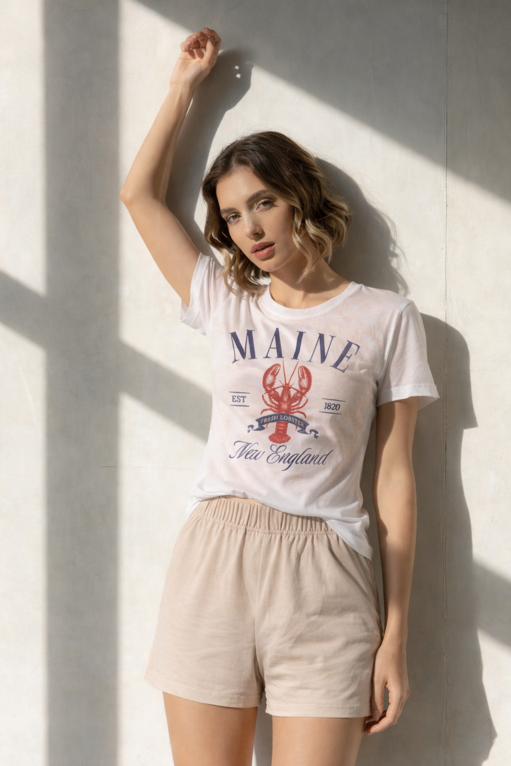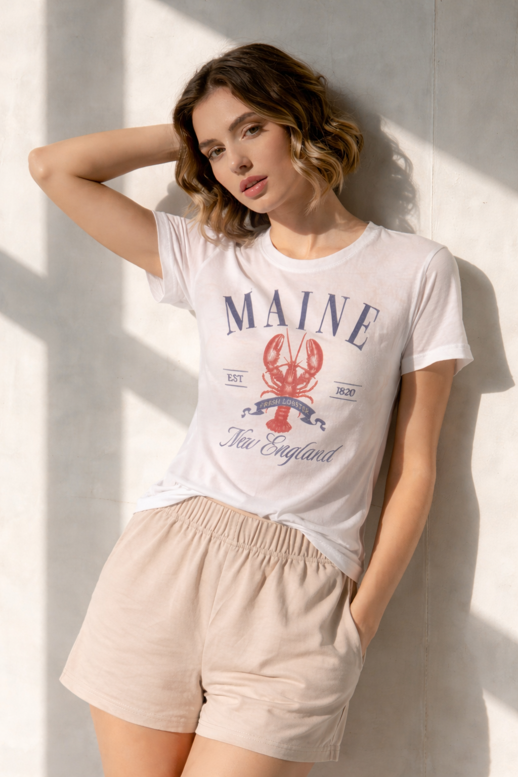 Bring a little bit of the coast home with you, this Maine lobster tee is made of 52% cotton and 48% polyester, no stretch, but has slight give
