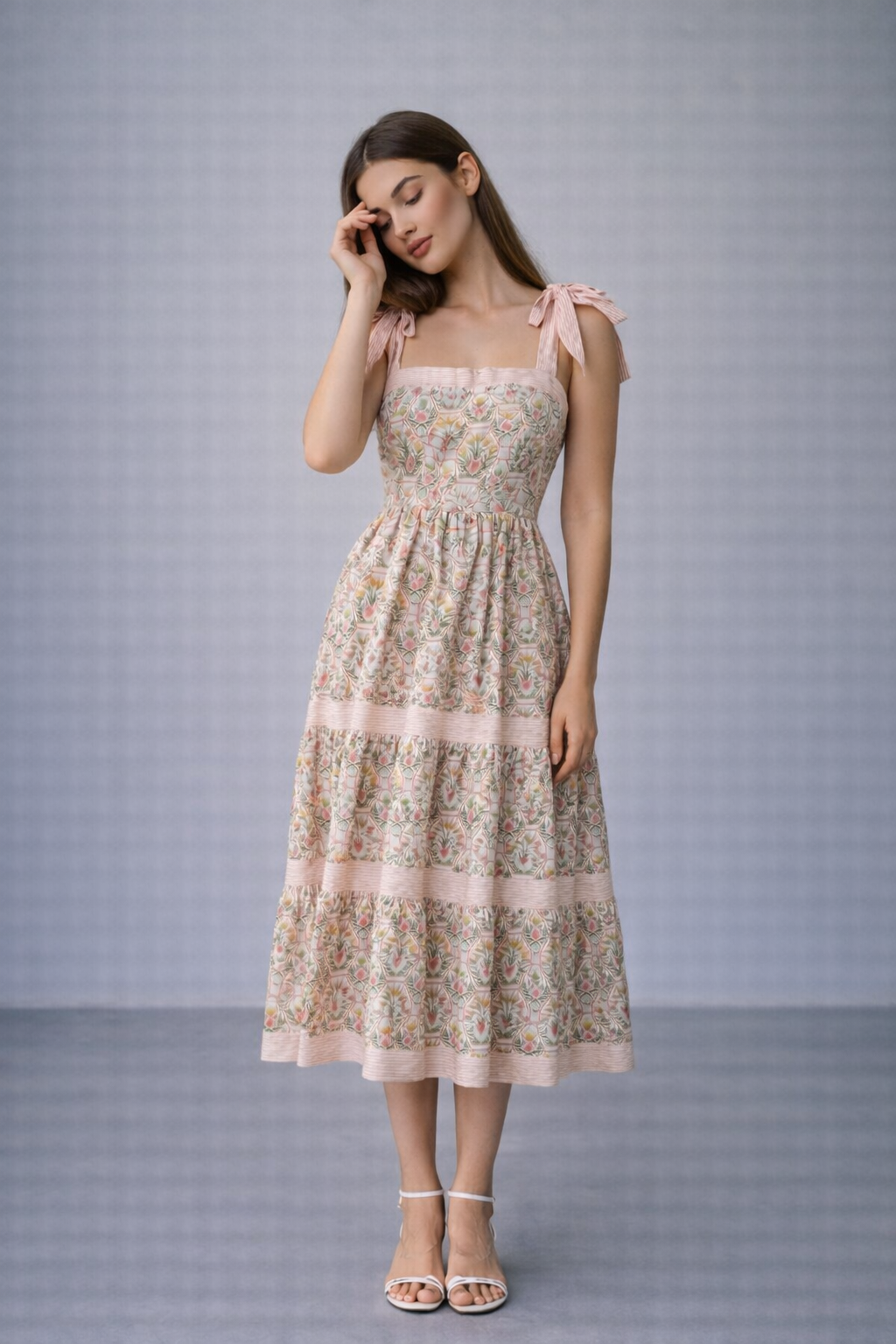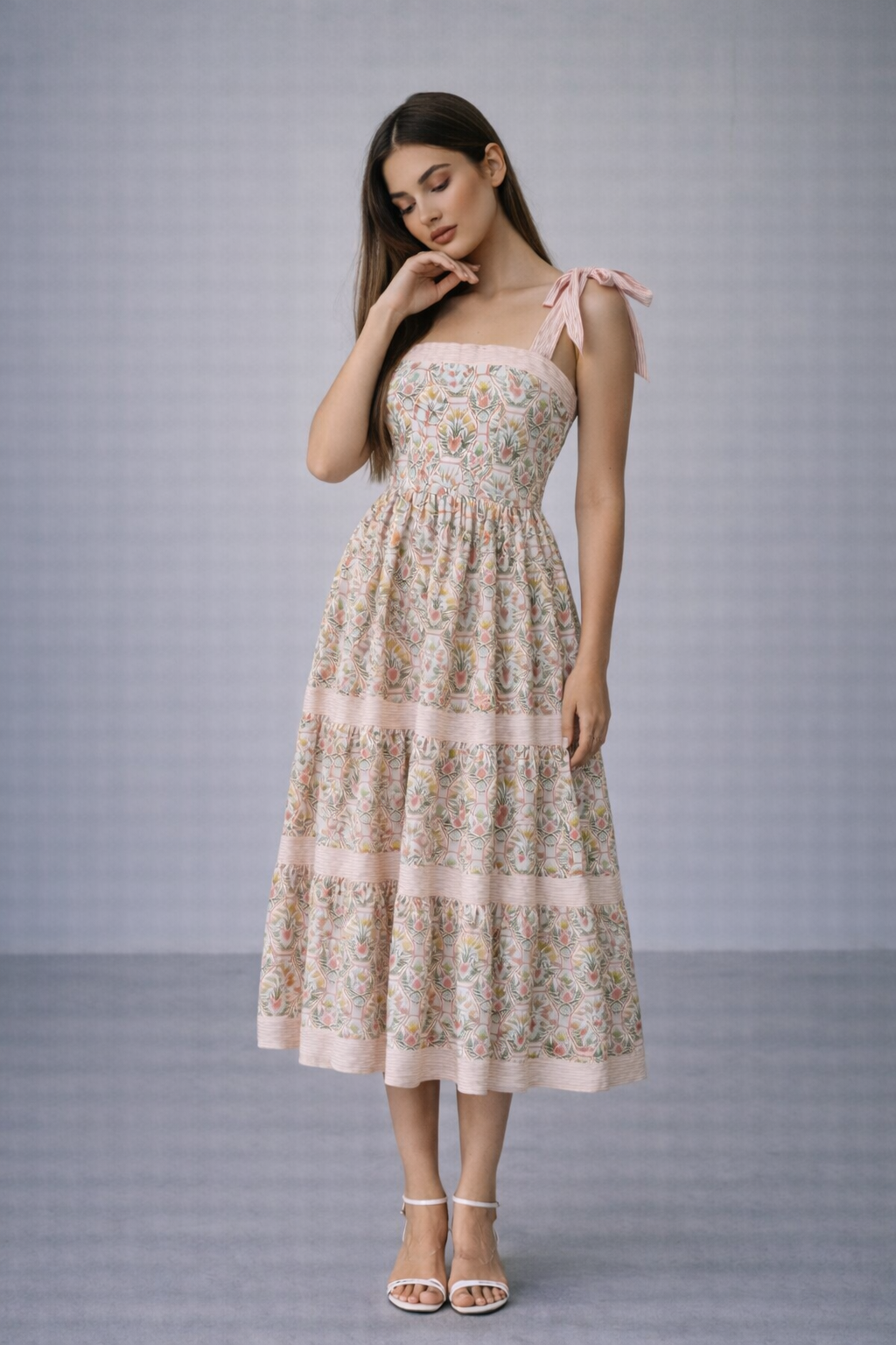 The April Floral Maxi features a vibrant floral print in pink and green, complemented by coral and white striped shoulder straps. Designed with a flowy and comfortable silhouette, it is an excellent choice for spring and summer occasions. Smocked panel in the back adds a little stretch. Product Type Maxi Dress, Self:100%Cotton, Lining:100% PolyesterAdditional information